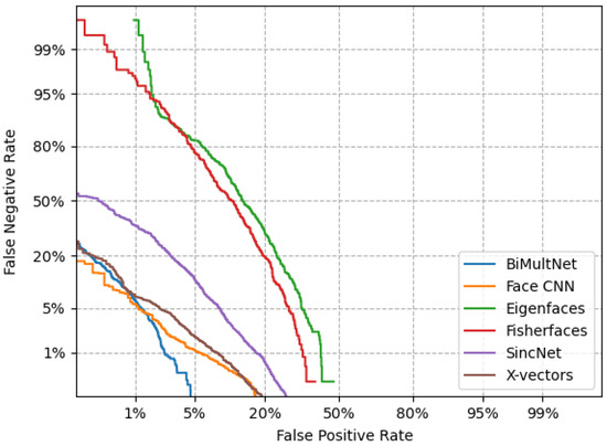 The Detection Error Tradeoff (DET) plots shown in Figure 2 present a visual comparison of the verification performance delivered by the considered biometric systems presented in this work. The curves were plot by pooling the verification scores of all data augmentation conditions generated by the best iteration of each system. The EER of each biometric system was calculated from their corresponding scores, obtaining the following values: BiMultNet 1.92%, Face ResNet 2.79%, Eigenfaces 25.84%, Fisherfaces 19.73%, Sincnet 7.24%, and Xvectors 2.9%. These results indicate that our proposed bimodal text prompted verification framework provided better results compared to unimodal biometric systems, regardless of the conditions presented by speech and facial data.