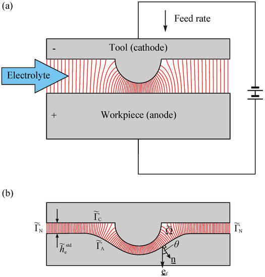 - Approximative analytical methods: Tipton [18] proposed the so-called -method, assuming the width of the interelectrode gap to be inversely proportional to , where is the angle between the normal of the local anode surface and the cathode feed direction (see Figure 1b). However, this method is only applicable in gap regions where is less than [19].