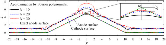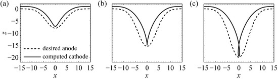 Figure 7 shows examples in which the surface profile of the anode described by Equation (25) with and is approximated by Fourier polynomials (26) of degree , and 30, respectively. The precision of the approximation increases with an increasing N since, for a continuous function F, the function sequence converges uniformly. The maximum deviation of the anode surface profiles and from each other, which is found at , is below ; however, the maximum deviation of the corresponding cathode surface profiles from each other is larger than . Furthermore, with an increasing N, the cathode shape becomes increasingly “distorted”: The cathode surface profile changes from regular (, solid line) over singular (, dashed line) to physically meaningless (, dotted line). The size of the “loops” in the physically unrealizable case increases with a decreasing distance to the sharp bends of the anode surface at and .