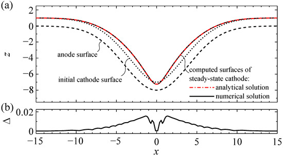 The surface profile of the cathode obtained after 200 iterations is shown by the solid line in Figure 4a, which overlaps with the analytical solution given by Equations (18) and (19) (dash dotted line) on the scale of the figure. For clearer visualization, the absolute deviation between these solutions, measured in surface normal direction, was computed and is shown in Figure 4b. The maximum of , denoted by , is less than , i.e., 2% of the width of the standard steady-state front gap.