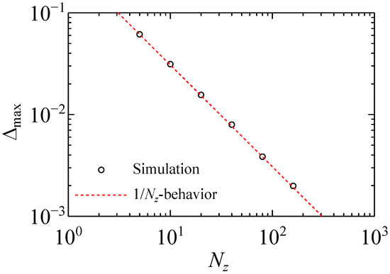 Mesh dependence of the maximum normal deviation, . The number of mesh cells along the gap is 200, and the number of cells across the gap is denoted by . The number of iterations carried out is 200 at step length .