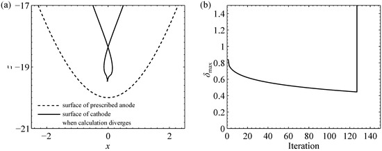 As an example of a case in which a non-physical shape of the cathode was obtained in the analytical calculation (cf. Figure 3c), the numerical computation procedure was applied to an anode shape with and . During the iterative optimization procedure, the cathode boundary forms a loop before the computation diverges due to errors resulting from the degenerated mesh. The solid curve in Figure 6a illustrates the cathode surface profile in the vicinity of the vertex in the last iteration before the computation diverges. Figure 6b shows the evolution of the convergence indicator (Equation (14)).