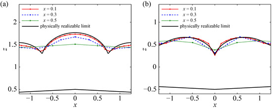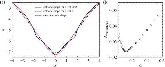 The qualitative behavior of the cathode shapes in Figure 3 can be understood by considering the derivative of (Equation (18)) with respect to . For , is positive for all , i.e., increases monotonously. For , is negative near , resulting in a physically meaningless loop of the cathode surface profile in Figure 3c. For given width ,