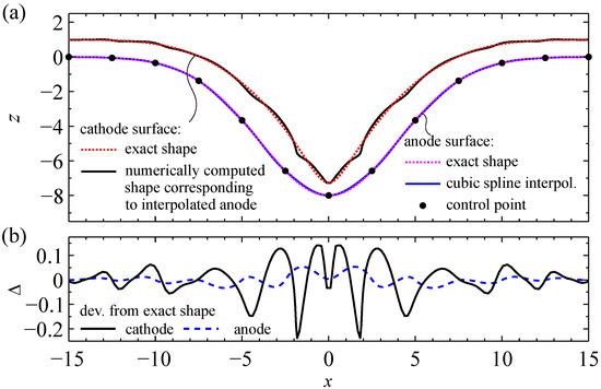 Cathode shape design for an anode interpolated by cubic splines (spatial dimensions are normalized to the width of the standard equilibrium front gap). The exact surface profile of the anode (dashed curve) in Panel (a) is defined by Equation (17) with and ; the surface profile of the “perturbed” anode (solid curve) is obtained by a cubic spline interpolation connecting 13 control points on the exact anode. The numerically calculated cathode to “perturbed” anode is obtained after 800 iterations at step length . The interelectrode gap is discretized by a mesh. Panel (b) shows the deviation of the “perturbed” electrode shapes from the exact shapes in surface normal direction.