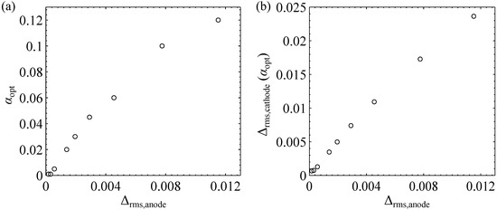 The deviations of the perturbed shapes of both electrodes from the respective nominal shapes (Equations (17)–(19)), which are measured in the direction of the surface normal, are shown in Figure 9b. While the maximum deviation of the nominal and the perturbed anode shape from each other is less than 6% of the gap width, the maximum deviation of the nominal and the perturbed cathode shape from each other is more than 23%. The latter deviation exceeds 25%, when the number of mesh cells along the gap is increased to . For , the simulation fails before convergence, which is caused by mesh degeneration around the “peak” of the perturbed cathode shape at , similar to the failure shown in Figure 6a.