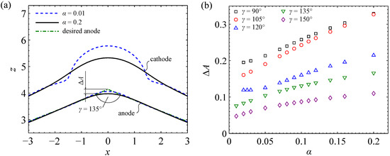The shape of the cathode corresponding to the “perturbed”, i.e., interpolated anode shape, was obtained by adjoint-based shape optimization and will be called a “perturbed cathode shape” in the following. The surface profiles of both electrodes are shown in Figure 9a. As illustrated by the upper solid line, the numerically computed cathode surface profile exhibits features with a high curvature, which are referred to as “peaks” in the following discussion.