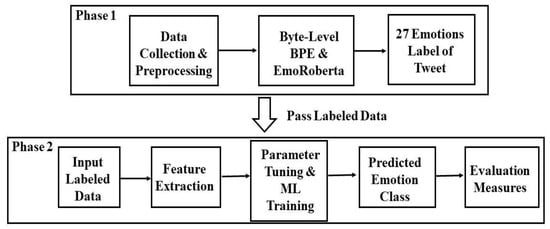 The final output of phase 1 is a labeled data set combining tweet content and emotion that further supply phase 2 for the classification task.