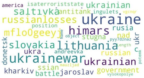 Figure 5 shows the word cloud for top buzzwords during the RUW tweet posts. The word cloud is very helpful to gain insights into a specific subject matter such as the RUW with a clearer vision from a different angle. In the word cloud, bigger words indicate a high frequency of appearance that does not mean that small-sized words are not useful. For example, if we look at Figure 5 more closely, we can observe that despite having a war between Ukraine and Russia, countries such as Slovakia, Lithuania, and the USA (see at top of the word cloud in small size) are also a topic of discussion. This finding ties in with the aforementioned Table 1 finding where tweets mentioned the US President’s Twitter account (@potus). Overall, the word cloud indicates the high frequencies of Ukraine-related tweets. There is a high mention of Russia’s defeat as well (see the word Russia losses). Thus, societal attention is more on Ukraine than on Russia.