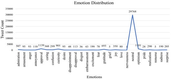 Distribution of 27 emotions according to the number of tweet count after emotion extraction from Emoroberta.