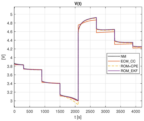 Having the above mentioned studies as points of departure, the purpose of the present study is to (i) extend the ROM proposed in [39] to include thermal dynamics, (ii) use the improved ROM for time-variant adaptation of the parameters of an ECM, and (iii) combine it with an EKF for estimation of microscopic (i.e., electrochemical) and macroscopic (i.e., voltage-current, SOC) states. The performance of the proposed estimation scheme is established by simulation studies with a comparison to a high-fidelity numerical solution of a detailed electrochemical model [9,54], in order to show the approximation quality achieved with the DMDc based ROM in combination with the EKF.