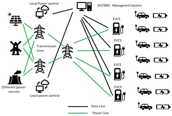 EV charging stations have become popular in smart cities. Different countries want to adopt EVCSs quickly [,]. These new charging stations use IoT to make life easier and allow EVCS operators more control. As an IoT device, the EVCS is always online to expand client services. This opens the door to cyberattacks on the EVCS ecosystem. The EVCSs are not only affected by the attacks but also both the electrical grid’s infrastructure and customers equally. Customers, Electric Vehicle Charging Stations (EVCSs), and the Electricity Grid make up the EVCS Ecosystem, as shown in Figure 1. All the EVCS ecosystem components are vulnerable to IoT cyberattacks []. While the long-term EVCS expansion needs rapid infrastructure development, this requires reliable electric vehicle charging stations. It is worth mentioning that there are a set of protocols that govern communication within the EVCS ecosystem. The Open Charge Point Protocol (OCPP) is a communication protocol for electric vehicle charging stations. It allows for the remote monitoring and management of the charging process, as well as the collection of usage data.