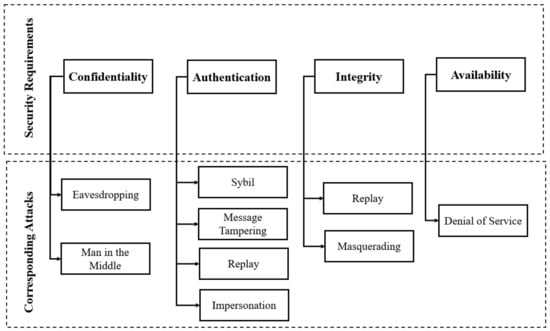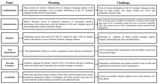 To mitigate these risks, EVCS manufacturers and operators can implement security measures such as encryption, firewalls, and intrusion detection systems, as well as regularly update the firmware and software of the charging stations. Additionally, following the guidelines and standards such as ISO/SAE 21434 and ISO 15118 can help to improve the overall cybersecurity of EVCS. The authors in [] discussed the security requirements in EVCSs and their associated challenges. The main challenges revolve around the extended CIA triad, which includes Confidentiality, Integrity, Availability, Nonrepudiation, authenticity (message freshness), and Authentication. Figure 2 depicts the security requirements and their challenges in EVCSs. In addition, the corresponding attacks mapped to the main security requirements are illustrated in Figure 3.