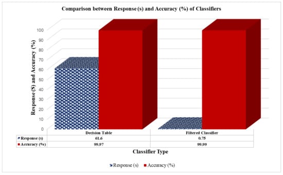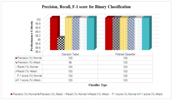 Figure 6 depicts the modelling time for the Decision Table, which takes 61.6 s, while it takes only 0.75 s to model the Filtered Classifier. Figure 7 illustrates the higher performance of the Filtered Classifier over the Decision Table in terms of accuracy (99.99% versus 99.97%). The binary classification algorithm with the highest accuracy was the Filtered Classifier (99.99%). The Filtered Classifier modeling time (0.75 s) was much quicker than the Decision Table classifier (61.6 s). This is because the Filtered Classifier runs in parallel, while the Decision Table classifier is sequential. The Filtered Classifier method assesses each class independently and in parallel (two distinct chunks of parallel operations). Figure 7 shows a comparison of the precision, recall, and F-1 Score of the Decision Table classifier versus the Filtered Classifier. When compared to cutting-edge methods such as those reported in [,], the Filtered Classifier exceeds the other Deep learning algorithms (maximum accuracy of 97%). Its accuracy is 99.99 percent.