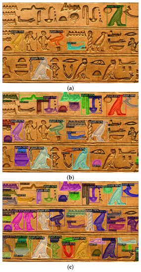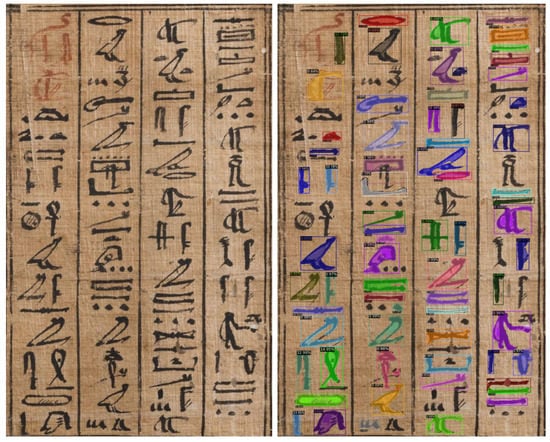 35], but, unfortunately, all these images are not segmented. Furthermore, most of the images are not yet ready to be used for training, having different dimensions, resolutions, point of views, etc. Thus, likewise in many machine learning problems, the construction of a dataset for training purposes needs an accurate selection and preparation of the images. More specifically, better results are expected if the images contain symbols as uniform as possible (in terms of dimension). Often, images contain both hieroglyphs and drawings, so that, even though Detectron2 works with input images of arbitrary size, cropping patches from larger images was performed to extract “text” areas.