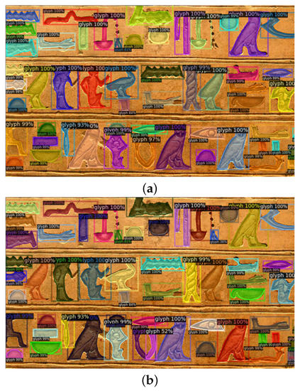 Figure 4a,b show the output masks selected for two different values of the objectness score threshold when the number of epochs used during the training stage is 300. It is apparent that decreasing the threshold produces an increase of the number of selected objects, even though low quality instances are included (the higher the quality of an output mask, the closer its approximation to the underlying glyph). It is also apparent that high quality masks will be necessary when a classification (and then transliteration/translation) task will be associated with the segmentation one. The quality of the output masks can be enhanced by tuning the number of epochs of the training stage.