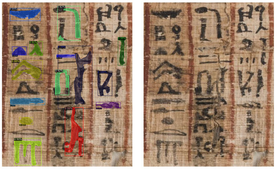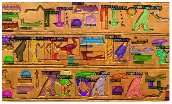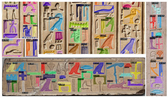 Many other tests were performed on images depicting signs on different supports (papyrus, pottery, wood), showing similar results as those described above. It is interesting to notice the ability of the Mask R-CNN to catch also glyphs that were not present in the train set. This can be ascribed to the ability of the deeper layers of the CNN to learn basic features (e.g., contours) and associate them to the recognition of a generic “glyph” object.