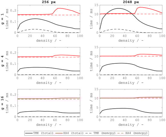 Comparison of execution time (System A) vs. density for different granularities g for images with 256 × 256 pixels and 2048 × 2048 pixels. Solid lines inidicate total execution time (including cudaMemcpy). Dashed lines show the respective cudaMemcpy time for the feature array (device to host). Errobars are omitted for clarity (standard deviation < 3% in all cases).