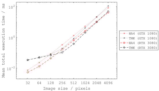 Mean total execution time for different image sizes. Mean is computed by averaging the total execution time for images with densities from 10% to 90% and granularity 1. Errorbars are omitted for clarity (standard deviation < 3% in all cases).