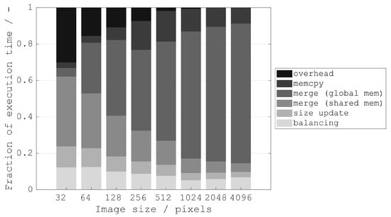 For small image sizes (≤128 px), the overhead for kernel launches is significant. Even though much of the tree merging is performed in shared memory, the overall computational effort outweighs the possible savings in memory transfer time.