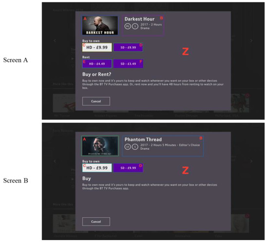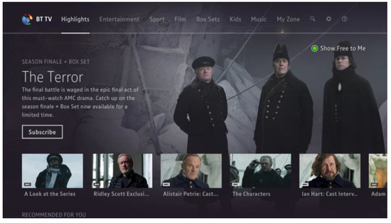 Eye tracking has also had success in lots of different areas of consumer research for a variety of reasons. In traditional research, a task may be carried out by the participant and then afterwards, they would be asked questions based on that task. For example, in a supermarket, a customer could be asked to carry out their daily shopping and then afterwards asked if they noticed certain labels, offers etc. and why those choices may have seemed appealing [23]. One of the problems within this area of research is that human memory is not faultless, and sometimes the customer will either forget, not notice or not think about why such a decision was made, which can make giving an answer to some of these types of questions difficult, or can provide false information at times [24,25,26]. The benefit of eye tracking software is that it has the ability to capture the gaze position of the participants’ eyes, and this position will be recorded at different time intervals depending on the device. This removes the potential for any memory issues and therefore removes human error in the process. If the trajectories of the participants’ eyes can be monitored at all times, then the reasons behind their choices become more apparent, whether because of colour, a bolder font, or a special offer price [27,28,29]. The purpose of the study at BTIIC was to evaluate TV customer experience by measuring participants’ eye movements while using BT Player on a television [11].