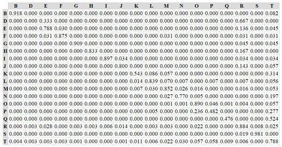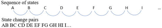 The concept of a Markov Model uses a system with a set of ‘states’ S = {S1, S2, …, Sn} where n is the number of states in the system, so for example, if S = {A, B, C, D, E, F…} S1 = A, S2 = B, etc. [54]. In a first-order DTMC, the probability of the current state is based solely on the previous state of the Markov chain. That is, where the time instants associated with state changes are t = 0, 1, 2, 3… and the actual state at a given time t (t ≥ 1) is denoted as qt, the probability of arriving at a given state, given its previous state, can be calculated as follows: