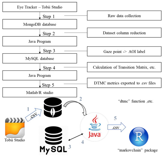 The raw data from Tobii software provides a significant amount of information by default, while only some of which are necessary for creating a Markov Model. It originally came in JSON format, and Tobii Studio converted it into CSV files. We saved the raw data into a MongoDB table to get a quick overview of it. There were only six attributes in the MongoDB database that were relevant to our research: “id eyetracker,” “participant name,” “local timestamp,” “GazePointX (ADCSpx),” “GazePointY (ADCSpx),” and “gaze event kind.” Initially, there were 59 columns in the table. The six variables extracted are described below: