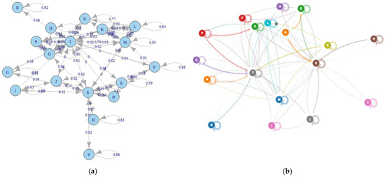 Intuitively, T is the state that most other states will jump to. Figure 23a is a static image, while Figure 23b is a screenshot of the animation of a Markov Model process on the browser. In Figure 23b, the thickness of arrows and directed lines indicates the value of probability. The animation of each transition is based on the transition matrix.