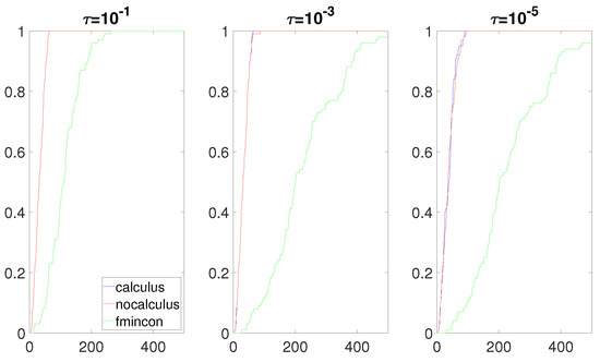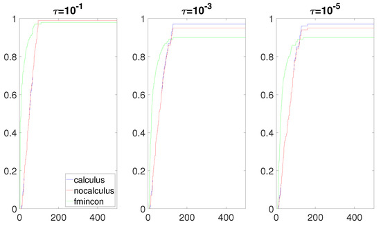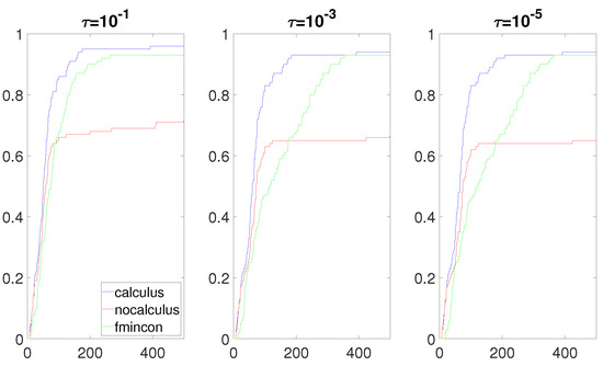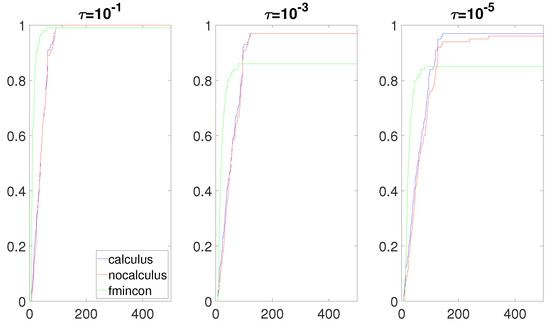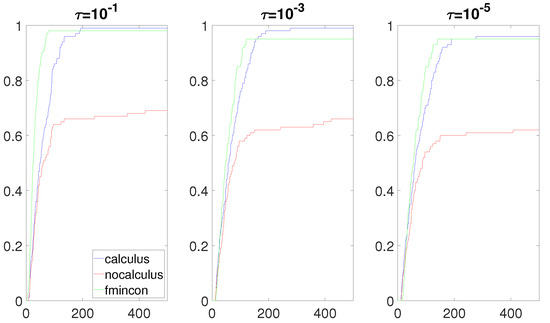 The most interesting results were obtained when the composite objective function F had the form and had a real root near the box constraint . Figure 8, Figure 9, Figure 10 and Figure 11 clearly show that the calculus-based approach was significantly more efficient and robust than the non-calculus-based approach for these four situations. Note that the composite objective function F was twice continuously differentiable on the box constraint, but F was not twice continuously-differentiable on the expanded box constraint (6). The composite objective function F was also not twice continuously differentiable on Using the non-calculus-based approach, it could be the case that or was undefined if one of the sample points landed exactly on a real root of This was very unlikely and it did not happen during the experiment. When using a calculus-based approach, this issue cannot occur, as and are twice continuously differentiable everywhere. This is clearly an advantage of the calculus-based approach. If a sample point is near a root of the value of F at this point can be a very large number. This could make the accuracy of and very poor when using the non-calculus-based approach.