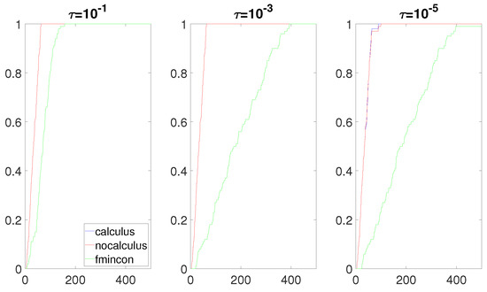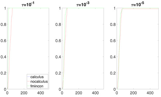 We now analyze Figure 4, Figure 5, Figure 6 and Figure 7. The performance of both approaches was almost identical. The calculus-based approach provided slightly better results. Compared to fmincon, Algorithm 1 was competitive and even outperformed fmincon when the numerator of F was a linear function (Figure 4). We note that having no roots of near the box constraint implies that the value of the composite objective function F does not drastically change on the box constraint. In other words, the Lipschitz constant of F on the box constraint is not a huge number. This helped obtain an accurate gradient when using the non-calculus-based approach. As such, in these four situations, the accuracy of the approximate gradients and Hessians computed with the non-calculus-based approach was similar to this computed with the calculus-based approach. Hence, the performance of the non-calculus-based approach was almost as good as that of the calculus-based approach.