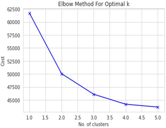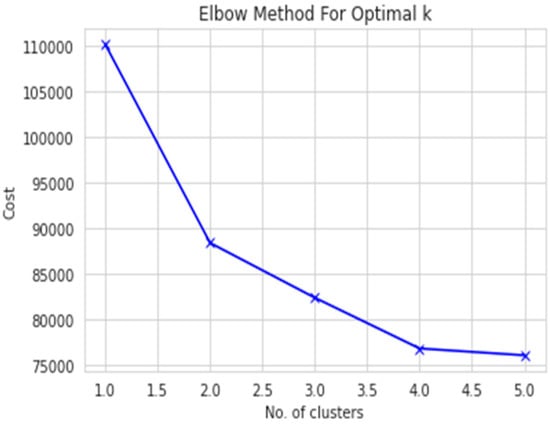 Since our data have been converted to categorical data, we will use k-modes analysis. To find the optimal number of clusters, we will first use the elbow curve with Huang initialization. An elbow curve creates a k-modes model with that number of clusters, fits the model to the data, and then calculates the cost (distance between the attribute modes of each cluster and the data points assigned to the cluster). The costs are then plotted on a graph using the “elbow method” to determine the optimal number of clusters. The elbow method looks for a “knee” or inflection point in the plot of costs, which is often interpreted as the point where the addition of more clusters is not significantly improving the fit of the model.