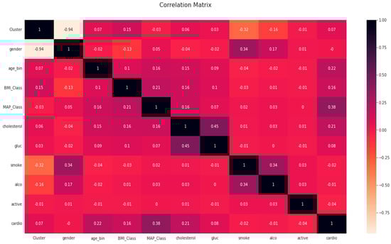 Further, a correlation table is prepared to determine the correlation between different categories. From Figure 5, mean arterial pressure (MAP_Class), cholesterol, and age were highly correlated factors. Intra-feature dependency can also be looked upon with the help of this matrix.