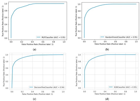 ROC–area under curve of (a) MLP, (b) RF, (c) DT, and (d) XGB.