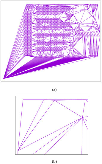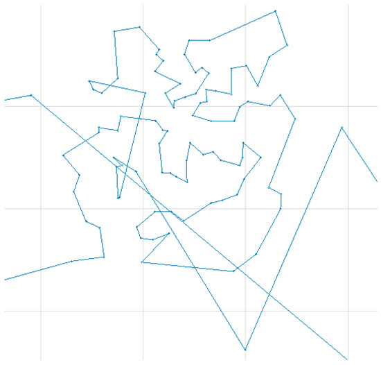The use of candidate sets can greatly reduce the number of permutations to be examined per point, but it is also likely that the procedure will miss good neighbours and, accordingly, will not find some connections (edges) that belong to the optimal tour. The implemented software allows us to determine the maximum number of allowed candidates per point to be used. Then only the closest neighbours are taken into account. When the set of candidates is limited to , for example, then some edges remain unconsidered as can be seen in Figure 2 in comparison to Figure 1a. Interestingly, the point at the bottom left is still connected to many other points. This is just because the point is itself one of the five Delaunay candidates for these other points.