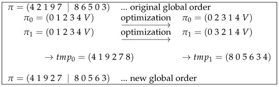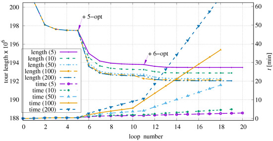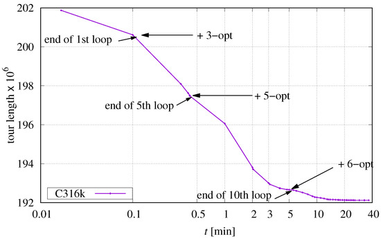 The most successful heuristics are based on the chained Lin–Kernigham method [11], which is one of the methods that try to optimize the entire tour by local improvements. It relies on the ideas of [12,13] and applies sequences of typically only 2-opt and 3-opt permutations. A k-opt permutation intersects a tour of connected points at k locations, i.e., k edges are removed from the graph and k other edges are inserted, ideally shorter on average than the original edges. A tour is called k-optimal if no further improvements can be obtained by using m-opt permutations with . There are also studies including 4-opt and 5-opt [14]. Such k-opt permutations steer the solution to a minimum, which is typically not the global one. Laporte gave a concise tour of the subject in [15].