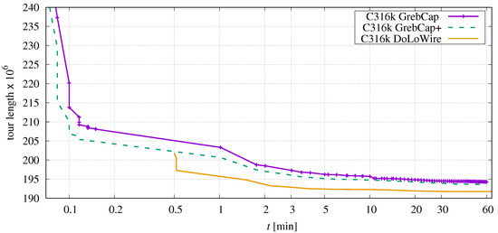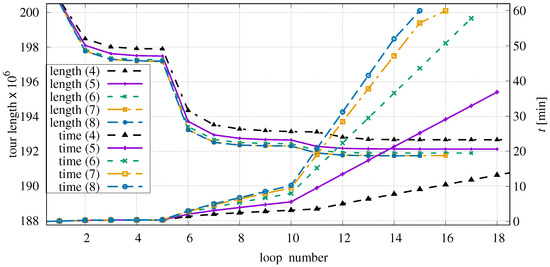 The proposed method Sys2to6 is now compared to LKH [56], which is widely known as a state-of-the-art heuristic for finding excellent TSP tours. The performance of Sys2to6 is mainly influenced by the values usedfor the number of candidates , the value, the number of parallel jobs, and the maximal duration of processing. The latter is set to a limit of 30 min (including the initial tour generation), in combination with . The other two parameters have been varied (, ). A good compromise could be found by using and . Note that without time constraints, larger values for both parameters would typically lead to shorter tours.
