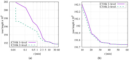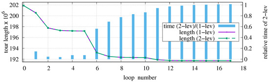 The parallel processing of nonoverlapping tour segments accelerates the progress of optimization in the early stages before the entire process asymptotically approaches a local minimum. The same could be observed for the implemented two-level data structure. It is very helpful at the beginning of optimization when many permutations can be performed. In the long run of asymptotic convergence toward the local minimum, the ratio between number of successfully applied permutations and the number of inspected permutations is very small. The positive effect of faster permutations is consumed by the increased efforts required to access the two-level data structure. For optimization without time limitations, the implemented one-level data structure is preferable.