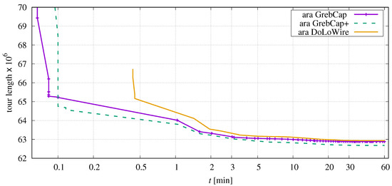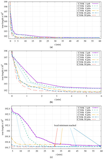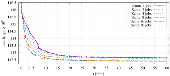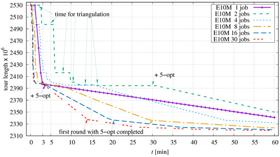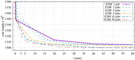 Based on the optimization progress, it can be observed that the acceleration of the improvements does not scale with the number of parallel jobs. Inspecting the plot of instance E3M.0 (Figure 17), the relation between number of jobs and required processing time t to reach a tour length of about is as follows: