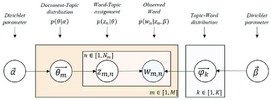 As shown in Figure 1, the words = 1, …, M, = 1, …, N are variables observed within the corpus of documents, while the topics = 1, …, K, are the distribution of topics for each document = 1, …, M, and the topic assignment for each word are the unknowns of the system that requests from the specific dataset processed. The parameters and are the hyperparameters of the model: represents the document–topic density, and represents the topic–word density. A large value of indicates that documents consist of multiple arguments, while low values of indicate that the documents contain few topics. Similarly, high values of indicate that the themes are composed of a large number of words and vice versa.