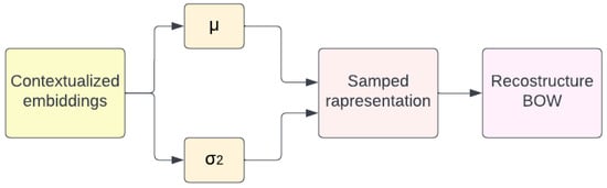 Contextualized Topic Models (CTM) were introduced by Bianchi et al. in 2021 [4]. The authors proposed an extended version of the Neural-ProdLDA based on the Variational AutoEncoder (VAE) [8]. The Neural-Prod algorithm trains an inference network that directly maps the BoW into a continuous latent representation. A network decoder then reconstructs the BoW by generating words from the latent model of the document. This representation is sampled from a Gaussian distribution with parameters and . In this model, the authors replace the input of the BoW with pre-trained multilingual representations. Figure 2 shows a scheme regarding the functioning of the CTM model.