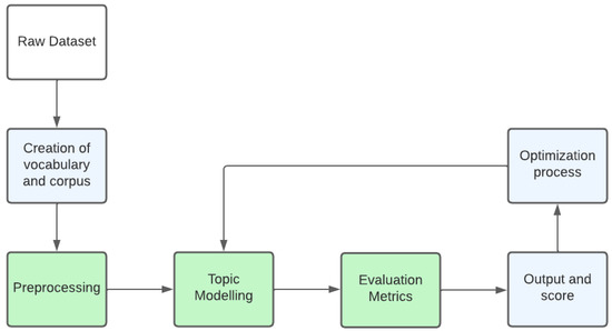 In our study, we used four metrics to evaluate the effectiveness of different algorithms in the case study. We considered the OCTIS framework [29] for pre-processing, training, analysis, and comparison of TM methods (i.e., LDA, NMF, CTM, Neural-LDA) by the four evaluation metrics (diversity, similarity, coherence, and classification score). A schematization of the workflow of the OCTIS framework is presented in the following Figure 3.