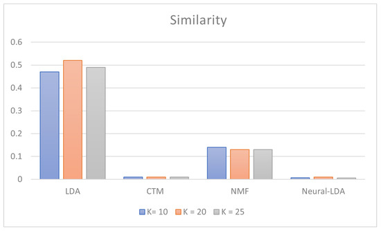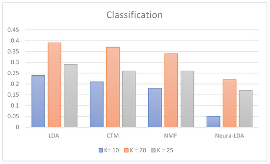 The NMF model has acceptable diversity values in the configuration; however, at the same time, the degree of similarity is too low to be able to define the outputs as performing. Concerning the Coherence and Classification metrics, we can observe a better performing configuration with values of . Compared with the CTM model, the Coherence is even higher, guaranteeing a greater degree of reliability. The resulting trend for each metric is depicted in Figure 4 for diversity, Figure 5 for similarity, Figure 6 for coherence, and Figure 7 for classification.