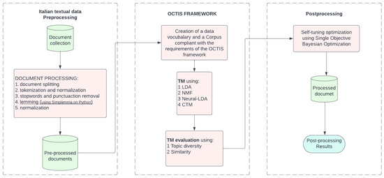 Process–work schema of 3 steps (from left to right): (1) pre-processing of the data in Italian natural language; (2) OCTIS framework; (3) post-processing for TM.