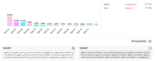 The figure shows the probability of a specific conversation (transcription no. 397) belonging to a topic, showing through a bar graph (top left) the percentage probability in descending order of the topic distribution. Further, by clicking on a specific topic, it is possible to obtain the top two k-words relating to that topic. It is also important to underline that words such as “Customer” and “Agent” were not considered for the topic document distribution step, as they have too high a percentage of use within the dataset.
