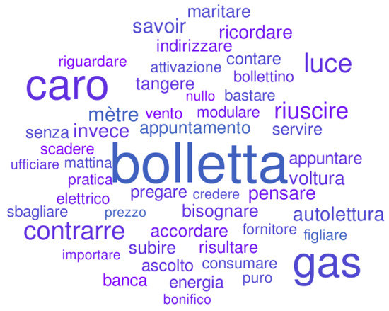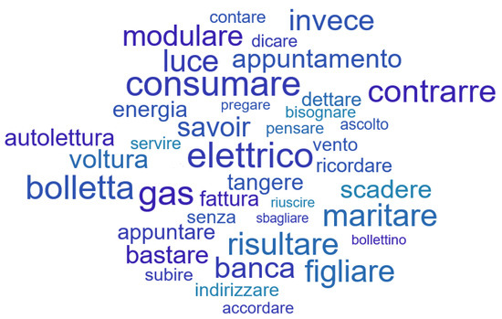 The word cloud graph for topic numbers 10 and 8 are depicted in Figure 11 and Figure 12, respectively. The word cloud is a Topic Visualization tool in which the words that best represent a specific topic are graphically emphasized, through the use of more striking colors and higher textual characters. From Figure 11 and Figure 12, it can be observed that the two topics share different top words, such as “bolletta” (the Italian for “bill”) or “gas”. The MSD method also showed that topics 10 and 8 cluster together. The word cloud of topic 10 represents the topic with the highest possibility of being relating to the transcriptions in the case study of this work.