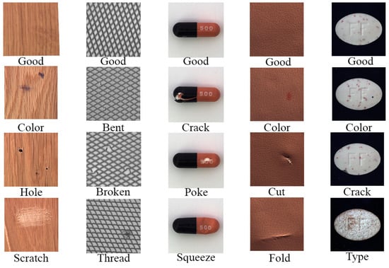 - Bergmann, P.; Fauser, M.; Sattlegger, D.; Steger, C. MVTec AD—A Comprehensive Real-World Dataset for Unsupervised Anomaly Detection. In Proceedings of the 2019 IEEE/CVF Conference on Computer Vision and Pattern Recognition (CVPR), Long Beach, CA, USA, 15–20 June 2019; pp. 9584–9592. [Google Scholar] [CrossRef]