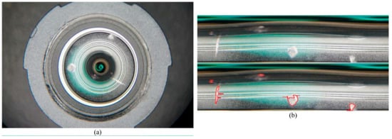 In terms of shape-based feature methods, literature [] proposed a method of detecting cutting defects on magnetic surfaces. In this method, the image of the magnetic surface is reconstructed using the Fourier transform and Hough transform, and, in order to obtain defect information, the gray difference between the original image and the reconstructed image is compared. A method for identifying defects on bottle surfaces was presented in reference []. This method includes a step for extracting regions of interest, where the boundary line of the light source is determined using a fast Hough transform algorithm. In [], global Fourier image reconstruction and template matching were proposed as a method for detecting and locating small defects in aperiodic images. Literature [] described how to detect surface defects on small camera lenses using Hough transforms, polar coordinate transforms, weighted Sobel filters, and SVM algorithms. Different types of defects were detected in several test images. In Figure 3, red highlights are used to indicate defects such as stains, scratches, and dots.