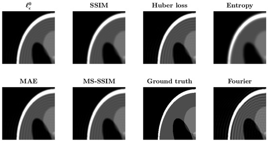 Figure 4, we present the optimal reconstructions of the Shepp–Logan phantom from the different metrics. For reference, we also show the ground truth without ringing and the Fourier reconstruction with added ringing. It can be seen from the figure that
