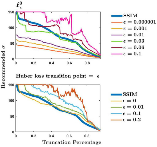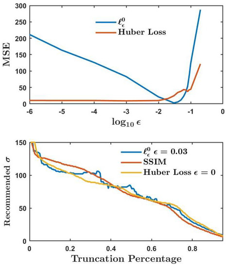 Finally, two of the metrics depended on an error threshold. We have investigated the effects of varying that threshold. Our results show that Huber loss is optimized by minimizing the threshold; in the limit, it becomes the norm. For this minimal threshold, it provides good agreement with the SSIM. We have also seen that has good agreement with SSIM for a suitable choice of . For smaller values of , it tolerates less error and so recommends more aggressive filters. It does so quite consistently: a small increase in Fourier domain truncation results in a small increase in the recommended filtering. For larger values of , this consistency is lost and the metric may not be as reliable as we might like. Thus, larger values of the threshold are recommended against.