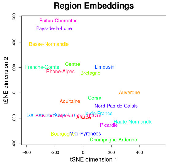 A tSNE visualization of the 10-dimensional embeddings for the different regions.