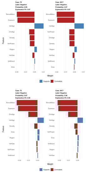 Figure 7 shows the prediction for a positive and negative test example by a logistic regression (left) and a neural network model (right). Note that both models predict that no claims will be made but the neural network model assigns a lower probability, which is reflected in the better AUC scores we obtain by neural network models. The features are ordered in decreasing order of importance. The colors show that if a larger feature value supports the class assignment, then we see that older cars and young drivers are more likely to make insurance claims. Note that we observed the very same patterns across different test examples. However, neural networks assigned much higher importance to the variable “area”. Most likely, there are different driving habits in different areas but these only become evident in combination with other features.